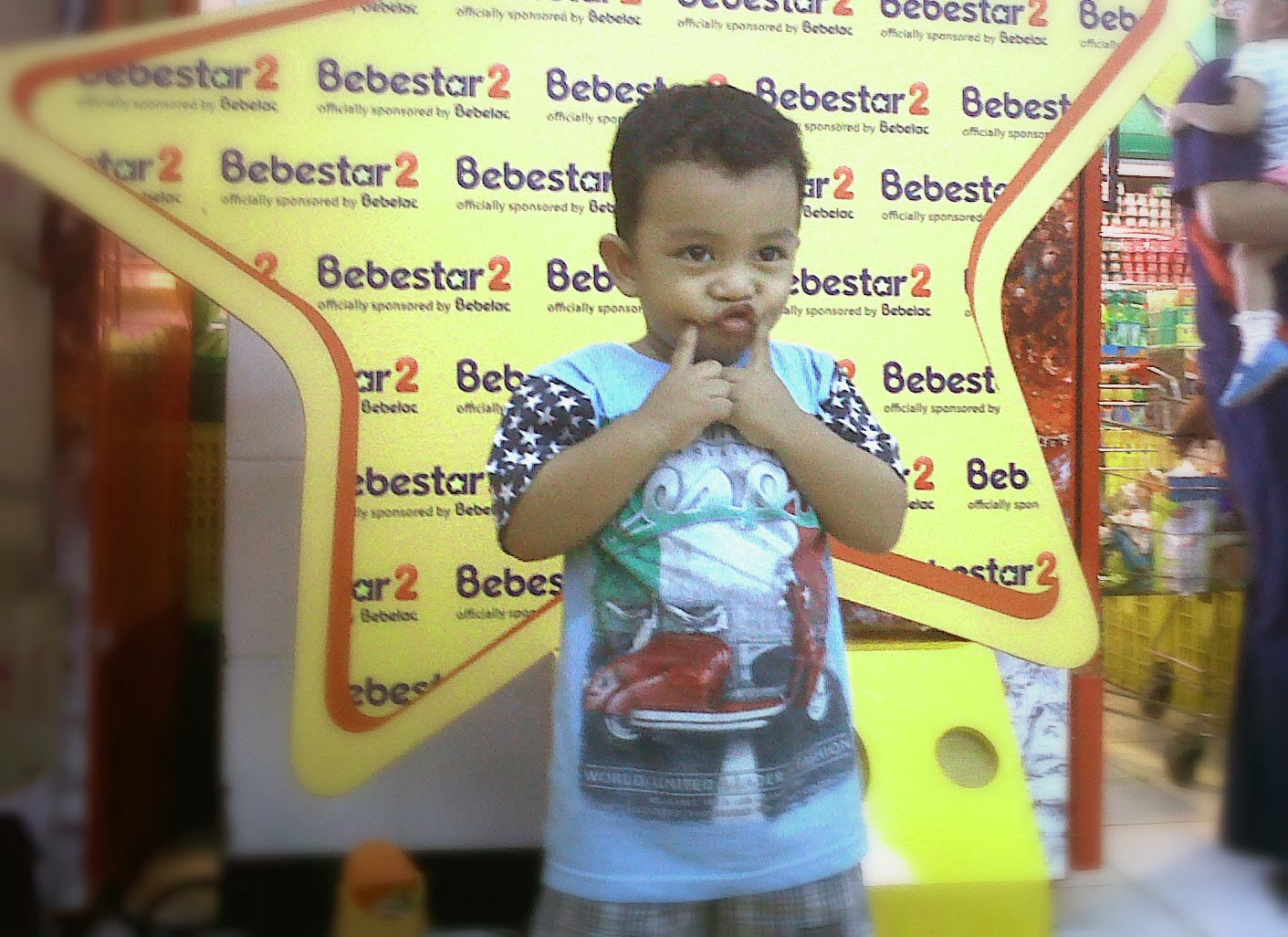 sementara embah keliling ngisi persediaan rumah tangga, biyyu dan ibu keliling nyari makanan sampe kemudian perhatian biyyu beralih ke area booth bebestar yang majang robot sebagai suvenir pendaftaran. ibu bilang kalo mw robot itu biyyu harus mau difoto didepan kamera, sambil nyanyi atau maen gitar. dia mau sih tapi gayanya enggak banget cos tegang setegang2nya. :))